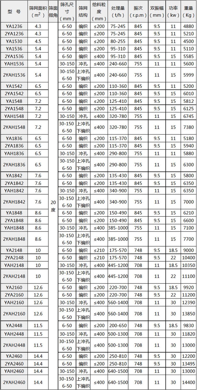 YA系列圆振动筛的主要技术参数: